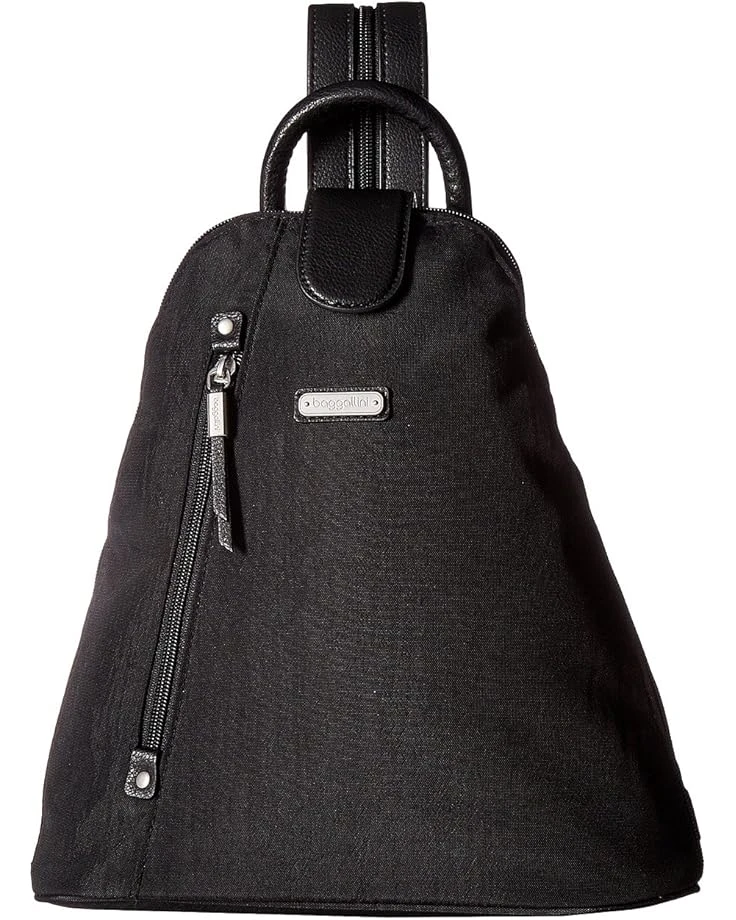 A sporty and creative design that sets your style above the rest, the Baggallini® Metro Backpack with RFID Phone Wristlet.SKU: #9840258Made of nylon.Zipper with tab and magnetic closure. Top carrying handle with dual adjustable shoulder straps.Exterior front and back zip pockets. Signature logo engraved hardware detail in front. Included phone wristlet with RFID protection.Flat bottom.Lining made of polyester.Interior back-wall zip and slip pockets. Imported. Measurements: