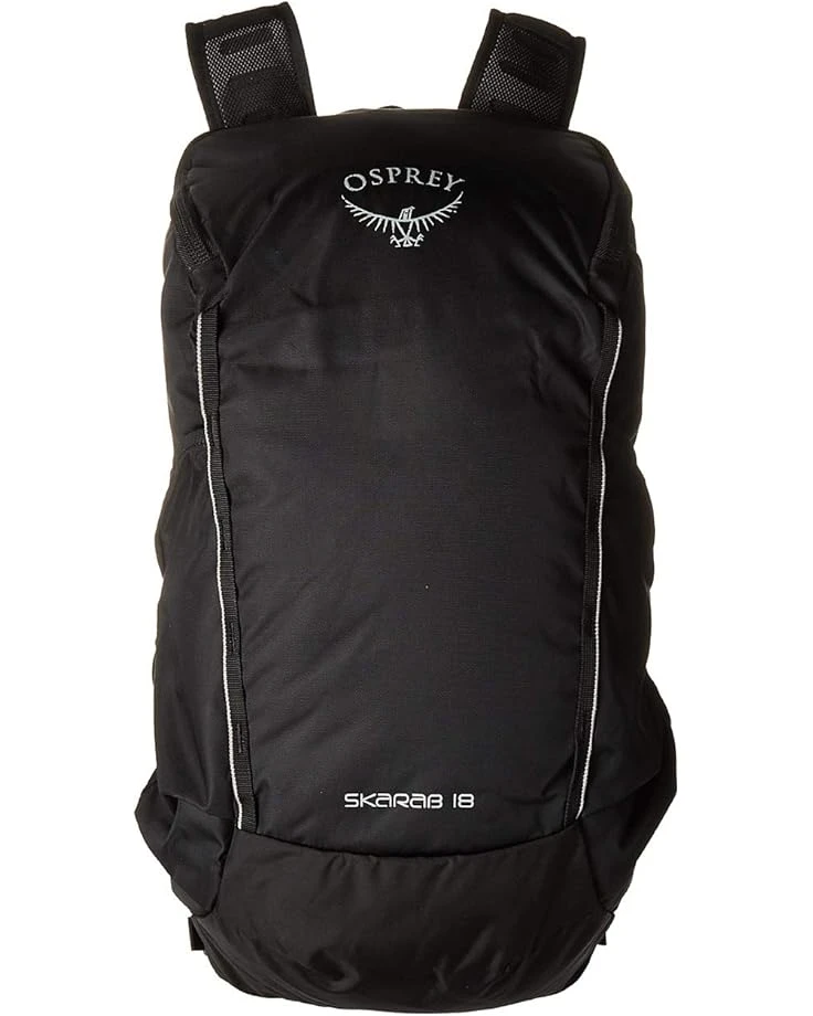 Osprey® gets you trail ready with the Skarab 18 pack. SKU: #9200360Minimalist pack that’s perfect for day hikes.Designed to comfortably carry up to 25 lbs.Spacious main compartment with zip closure.2.5L reservoir included. Heat-embossed, scratch-free pocket with zipper closure. Trekking pole attachment.Panel access to main compartment.Front panel bungee for external storage.Mesh side pockets for water bottles.Side compression straps for added load management.Adjustable, 20mm webbing hipbelt.Adjustable shoulder straps. Webbing haul handle.Hydration valve attachment at sternum.Material: